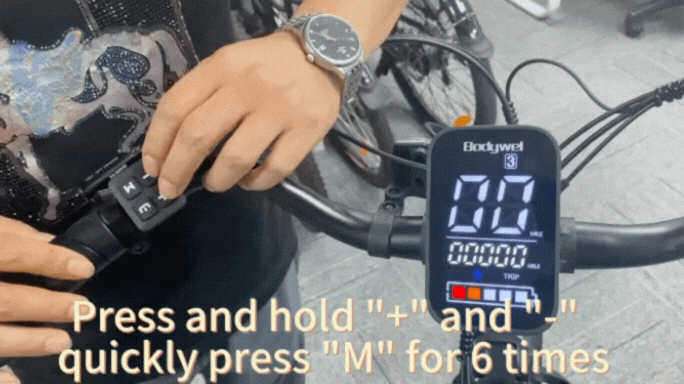 1. Press and hold both “+” and “-” keys, then quickly press the “M” key 6 times.